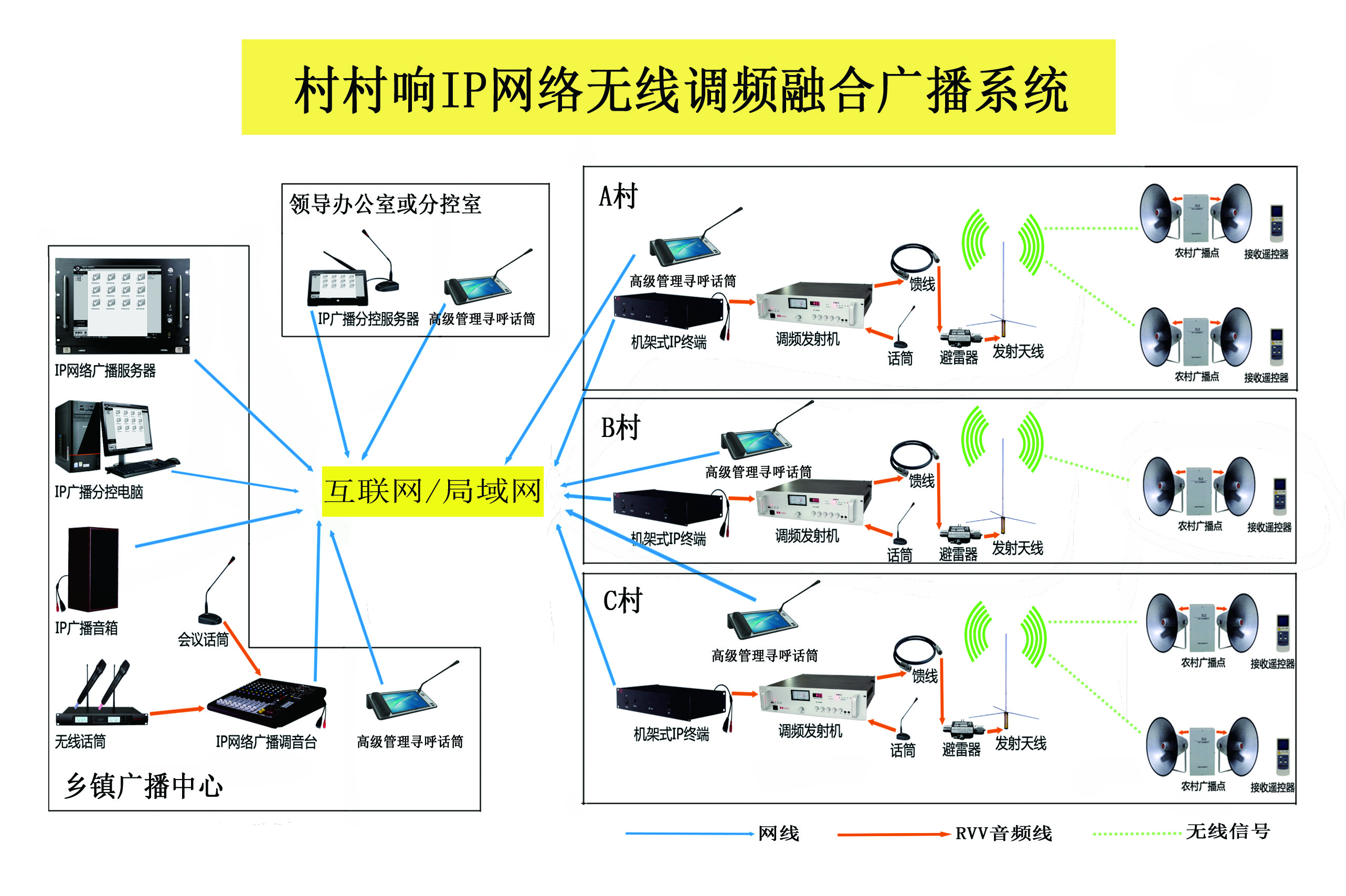 IP網絡無線調頻融合廣播係統不是將IP網絡廣播和無線調頻廣播的簡單組合,而是因地製宜的深度融合二者的各自優勢特點,以達到1+1遠大於2的目標,對於有線網絡還未廣泛覆蓋的偏遠地區或者布線成本偏高的農村地區,通過無線調頻廣播來實現廣播信號傳輸,是IP網絡廣播係統的很好延伸;而對於無線調頻信號難以覆蓋的地區,如:山區,信號屏蔽區等,由於山體對無線信號的阻隔,無線信號無法穿透傳輸,轉而用IP網絡廣播的網絡網線來遠程傳輸廣播信號,是無線調頻廣播係統的很好補充。根據不同的環境、不同的要求,選擇合適的廣播係統能讓廣播方案更靈活、施工更簡便,施工周期更短,更好的滿足客戶的需求。