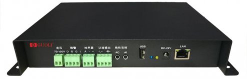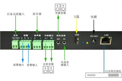 1個RJ45網口、1個DC電源口、1路線路輸入(3.5接口)、1路線路輸出(3.5接口)、1路拾音器輸入、1路後備功放輸入、2路定阻功率輸出、1路報警輸入、1路報警輸出、1個USB接口 |