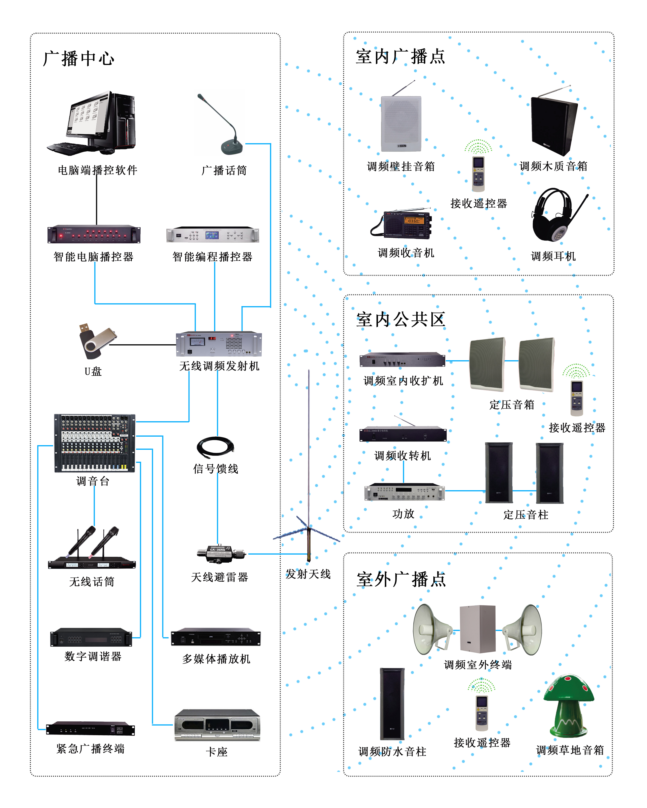 村村響IP網絡+無線調頻融合廣播係統拓撲圖